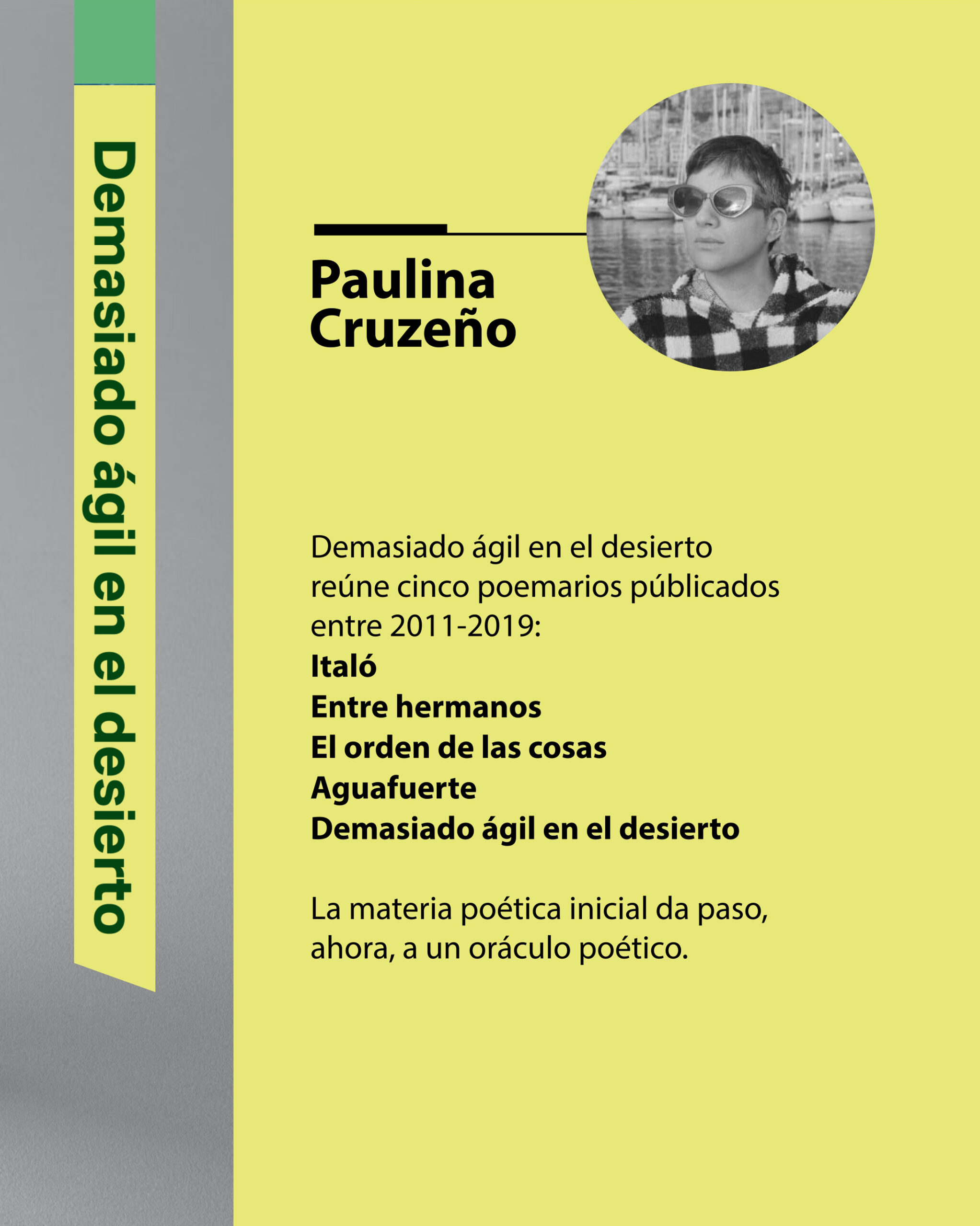 Demasiado ágil en el desierto reúne cinco libros publicados entre 2016 y 2019 por Paulina Cruzeño: Italo; entre hermanos; El orden de las cosas; Aguafuerte y Demasiado ágil en el desierto.